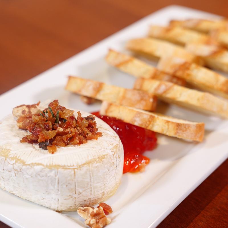 Topped w/ crispy bacon& toasted walnuts, served w/ sweet pepper jelly & crostini.